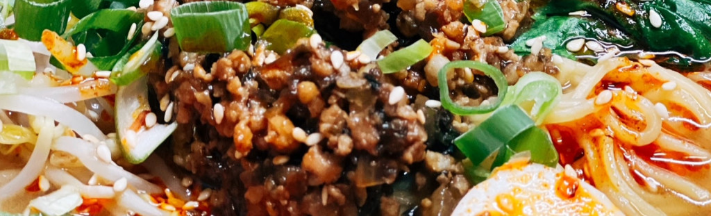 Double black miso broth, spring onion oil, fried shallots, and choice of spiced ground pork, soy chicken or sweet fried tofu